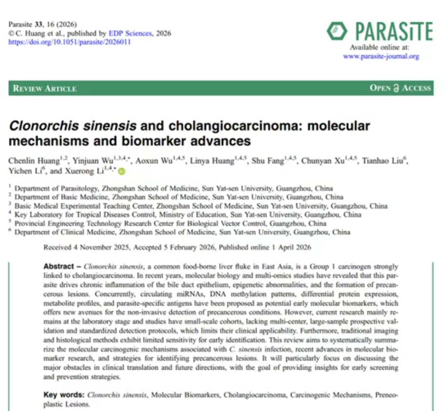 近日,我院2024级基础医学拔尖基地本科生黄琛霖,以第一作者身份在Parasite杂志发表题为《Clonorchis sinensis and cholangiocarcinoma: molecular mechanisms and biomarker advances》的综述文章,系统梳理华支睾吸虫与胆管癌的关联机制及分子标志物研究进展,为相关疾病的早期筛查与精准防控提供重要理论支撑。
