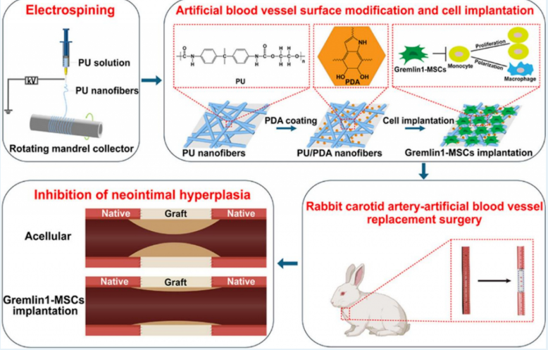 中山大学向秋玲/刘瑞明/项鹏合作揭示Gremlin1修饰间充质干细胞提高小口径静电纺丝聚氨酯人工血管移植通畅率