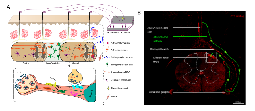 A图示意神经调控技术—电针刺激脊膜支的传入神经纤维末梢,通过背根神经节神经元的神经纤维将信息传递到脊髓,并通过其末梢释放降钙素基因相关肽(CGRP)诱导宿主神经元分泌神经营养因子-3(NT-3),促进移植的基因修饰成体干细胞源性神经元或神经元样细胞在受损伤脊髓中存活、维持分化和迁移,并与脊髓宿主神经环路整合。