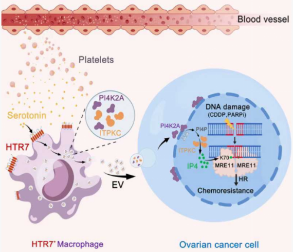 研究团队构建了模拟临床耐药演进过程的高级别浆液性卵巢癌小鼠模型,结合单细胞测序与代谢组学分析,发现:浸润至肿瘤的血小板释放的血清素,会作用于表达受体HTR7的特定巨噬细胞亚群,进而激活HTR7-PLC-Ca²⁺信号轴,刺激该群巨噬细胞大量分泌细胞外囊泡,并将肌醇代谢关键酶(如PI4K2A、ITPKC)等递送到肿瘤细胞,导致肿瘤细胞核内的肌醇-1,3,4,5-四磷酸(IP4)水平显著升高。核内的IP4通过直接结合MRE11,增强MRE11-DNA亲和力,从而提升肿瘤细胞的HR修复能力,导致对铂类药物及PARP抑制剂耐药。
