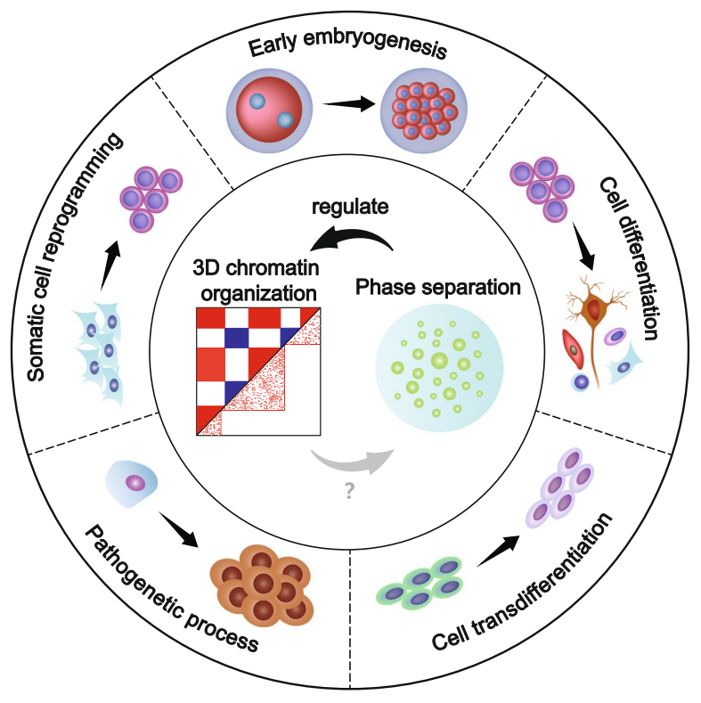 多项研究表明相分离是染色质三维结构的重要调控因素之一。转录因子可以通过相分离来促进染色质三维结构的重建,进而控制细胞命运转变。而细胞核内异常蛋白的相分离则会导致染色质的错误折叠,并促进疾病的发生发展。因此,深入研究染色质三维结构与相分离的相互调控关系有助于揭示生理和疾病状态下的细胞命运调控机理。