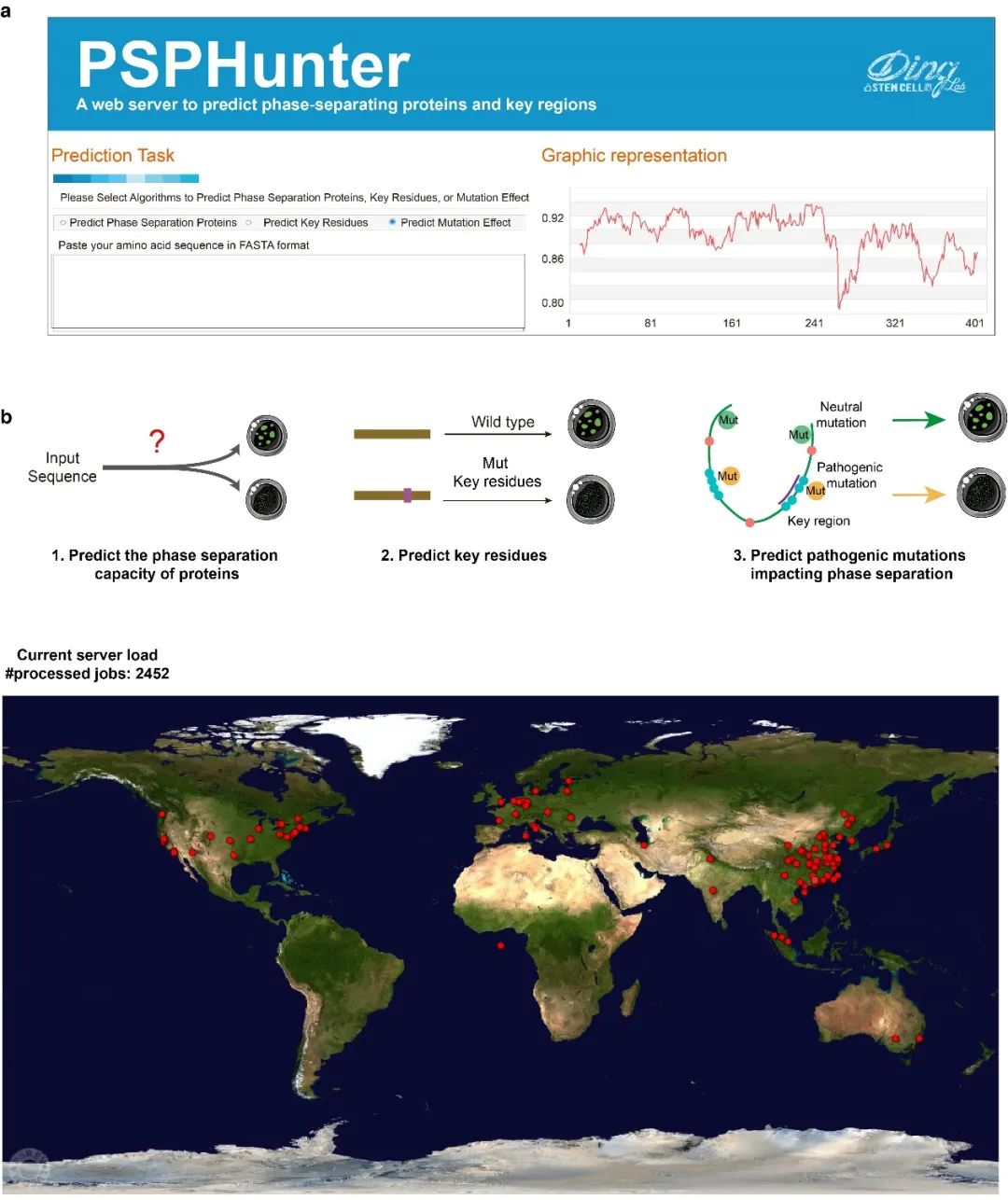 此外,研究人员开发了一个用户友好的网站(//psphunter.stemcellding.org/) 实现PSPHunter功能,提供了三个模块,仅需输入蛋白质序列,即可实现识别关键氨基酸、预测蛋白质相分离能力以及评估突变对相分离的影响。目前基于该算法开发的网站已成功上线,并已处理计算任务2400+,为相分离领域的研究提供了重要的工具和支持。